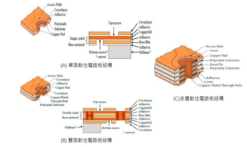 軟性印刷電路板(FPC)可依機械、熱與化學需求設計,常用於需貼合或嵌入有限空間的電子裝置。主要結構類型包括:(A)單面、(B)雙面與(C)多層軟性電路板。